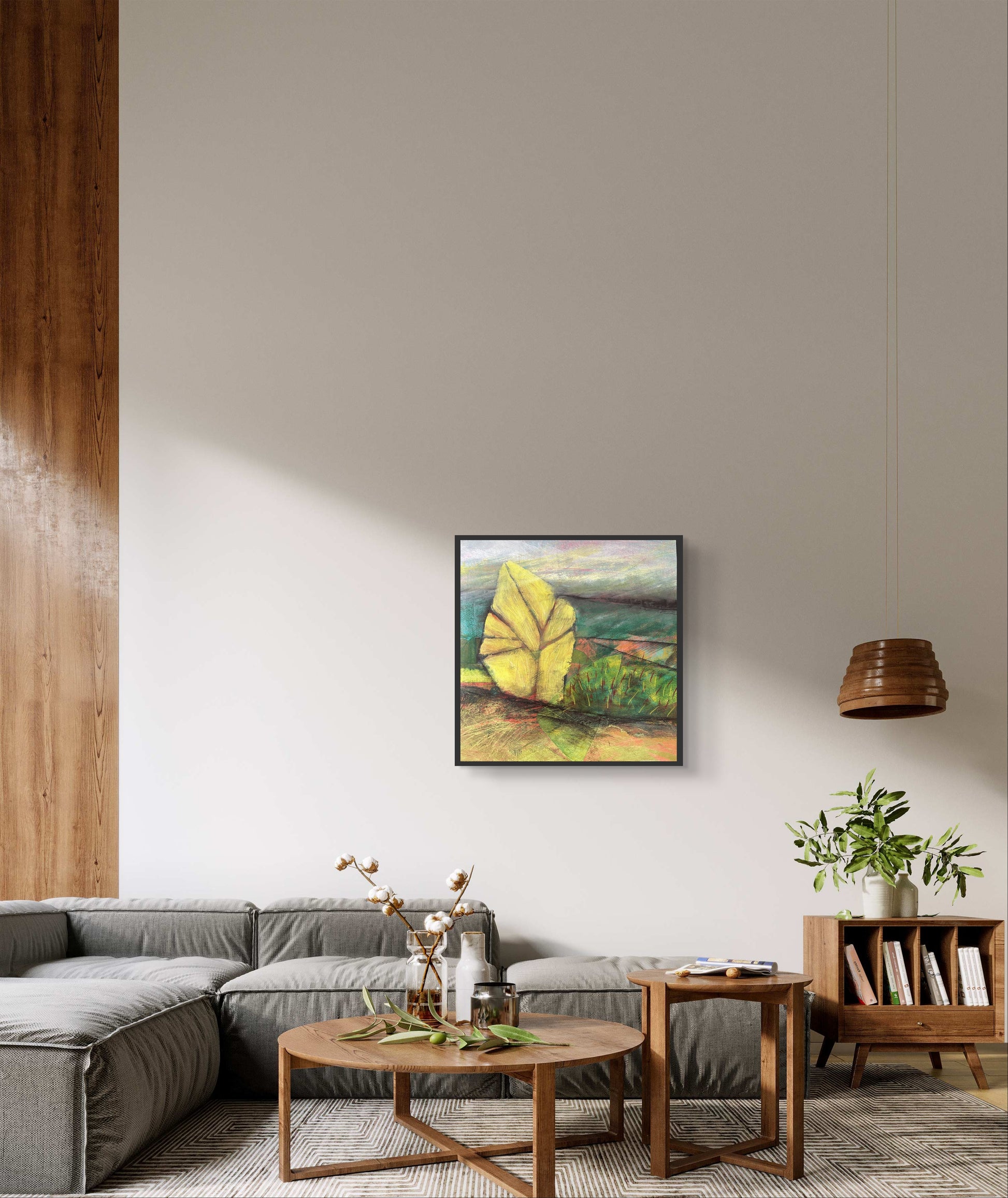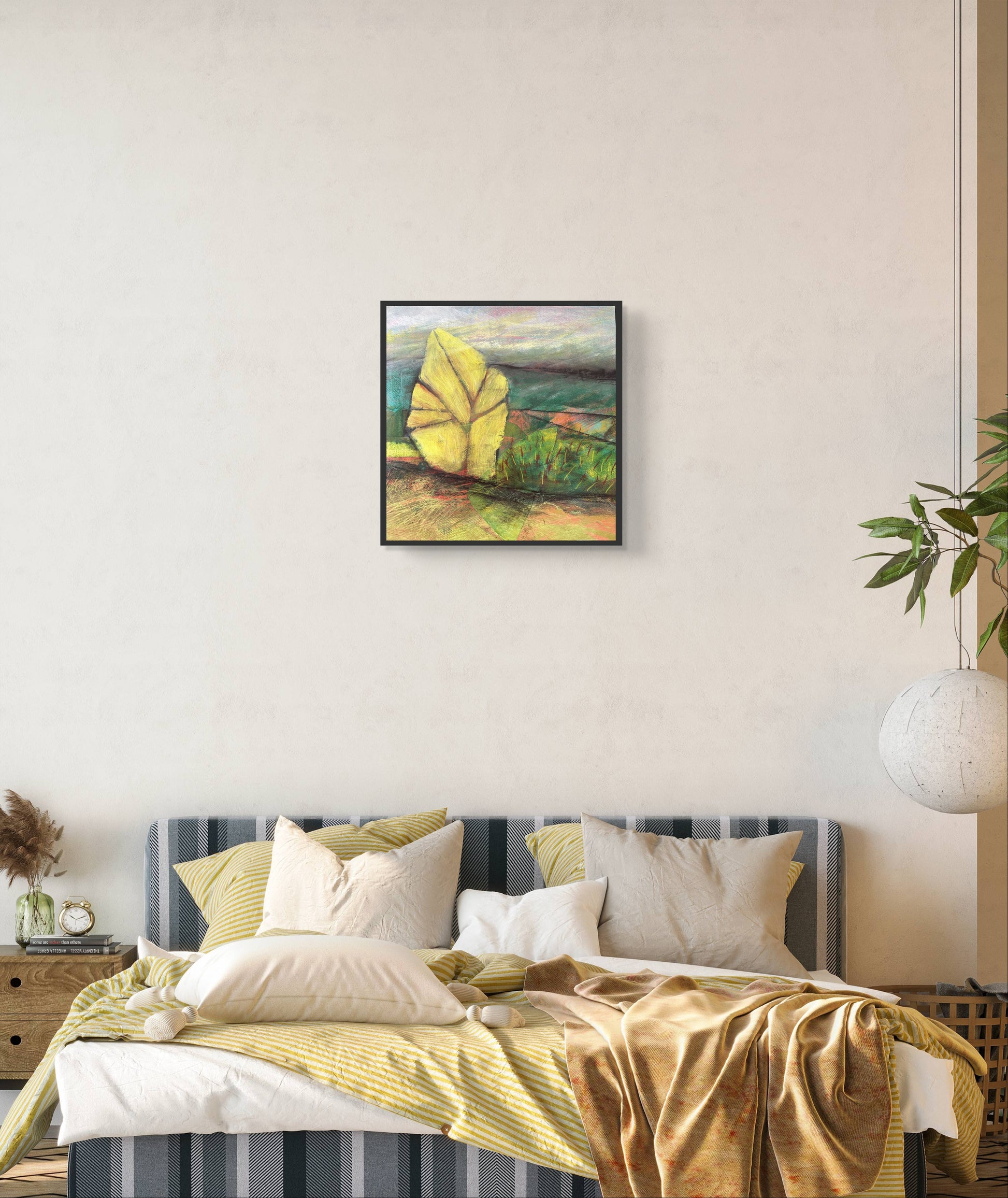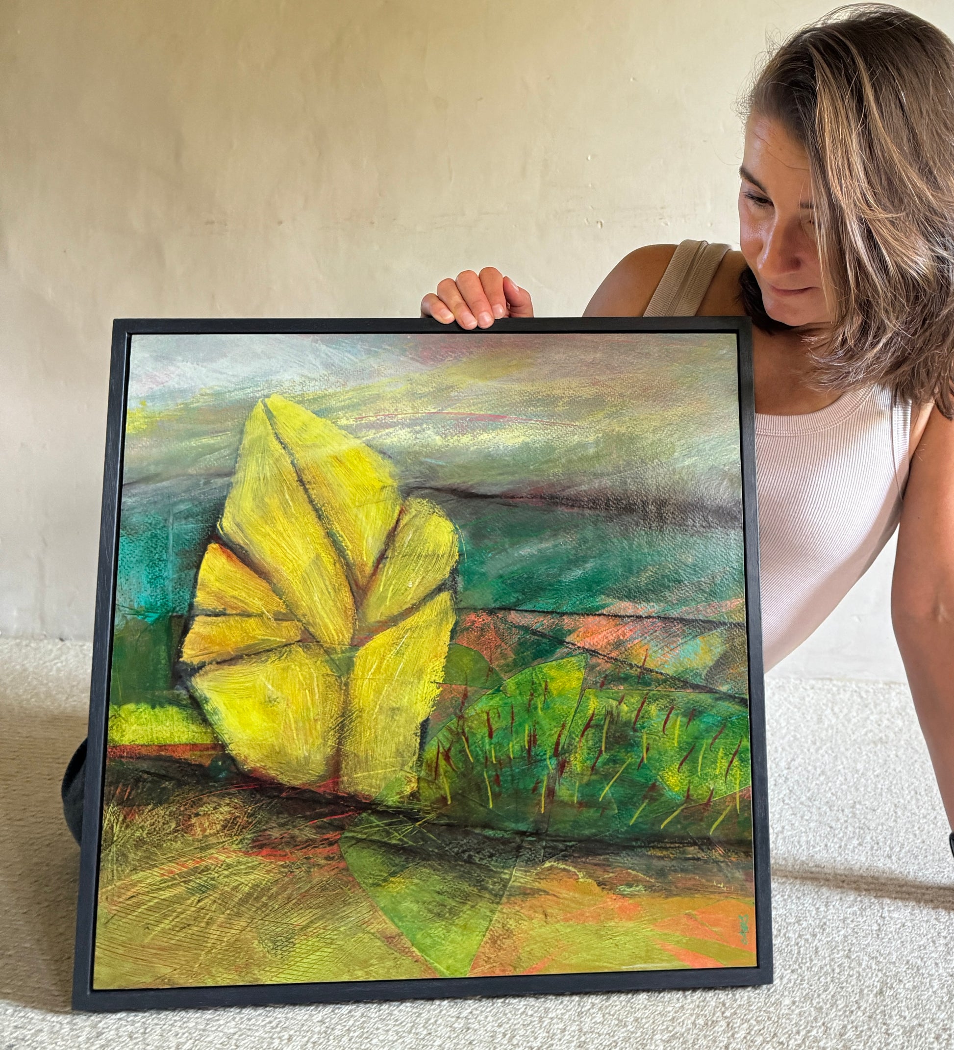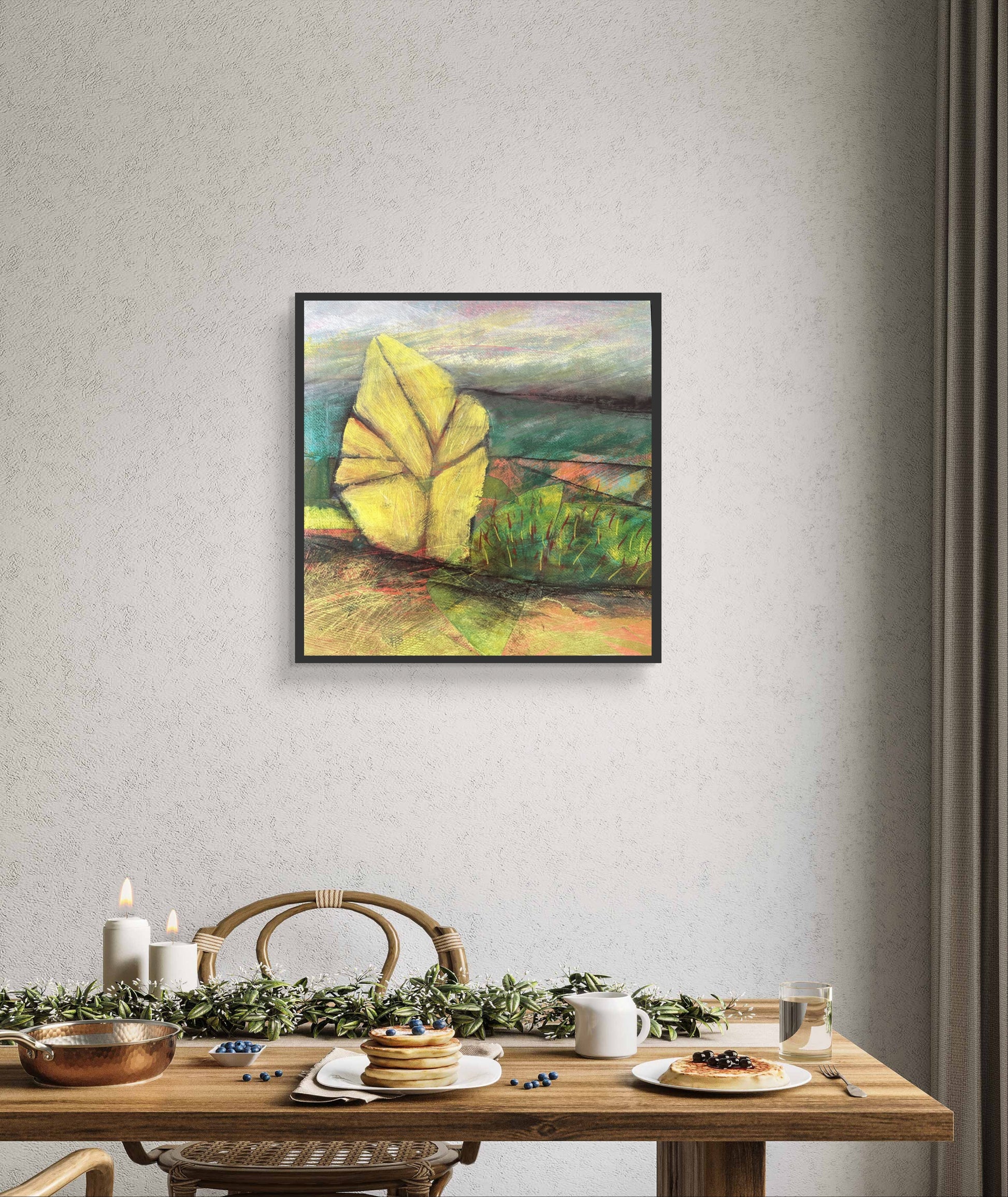 This is a mixed media work made in acrylic, collage and pastel. Sealed andvarnised on panel, framed in oak frame, painted with beeswax finish. Ready to hang, Size 65 x 65 cm