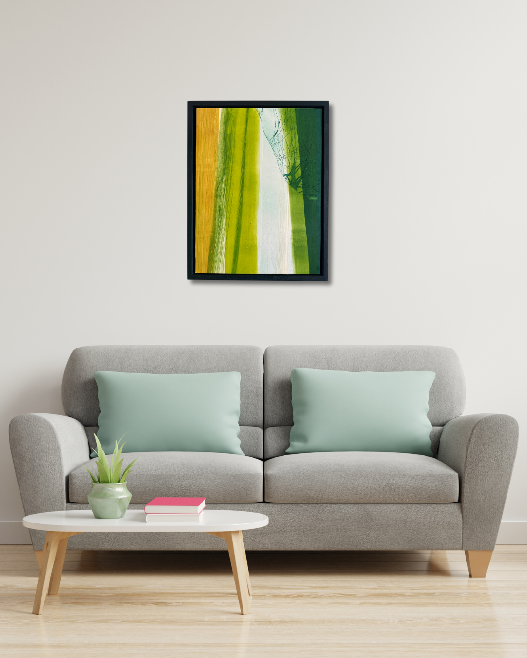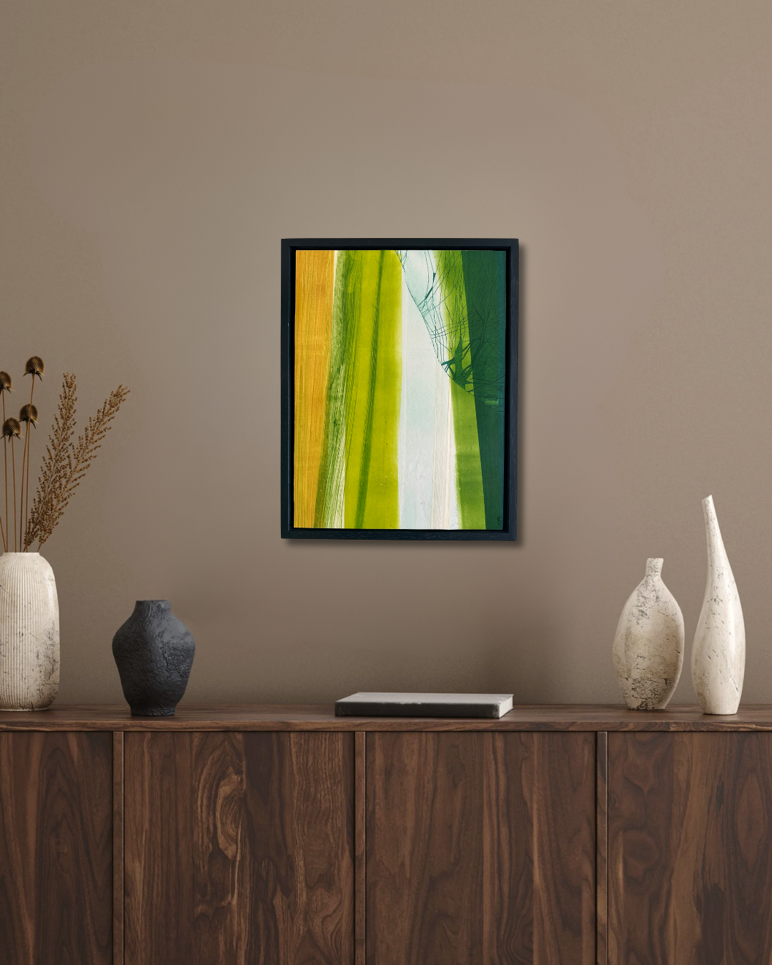 This monotype with collagraph was inspired by sketches of nature. Mounted on wooden board panel sitting in hand crafted box frame, sealed with acrylic and cold wax medium.